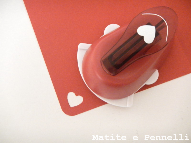 Per prima cosa prendete il foglio di carta comune di colore rosso e create, con le fustelle, le forme di tanti cuori sulla parte superiore centrale del foglio e ai due angoli della parte inferiore del foglio.