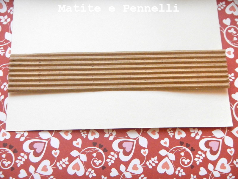 Mentre aspettate che la colla asciughi, ritagliate dal cartoncino con decorazione "romantica" un cuore. Successivamente ritagliate una striscia di cartoncino ondulato di queste dimensioni: 14 cm di lunghezza (ad abbracciare la lunghezza del biglietto) e 3 cm di altezza.