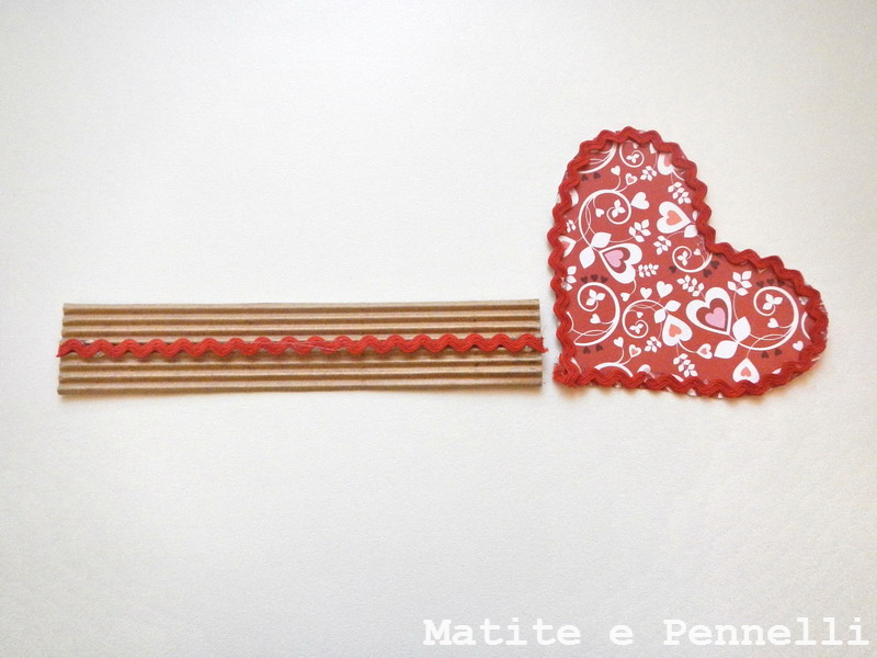 Con l'aiuto della colla a caldo applicate la passamaneria rossa lungo il contorno del cuore e al centro del cartoncino ondulato, per tutta la sua lunghezza.